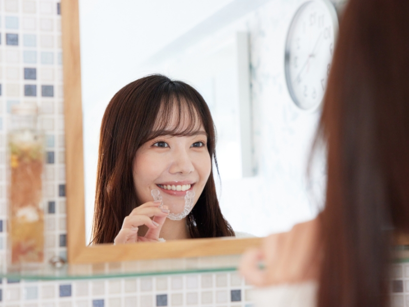 マウスピース矯正の利点は、装置が透明なので矯正装置を装着しているとわかりにくい点です。そのため、接客業や営業などの人と接する頻度が高い職種の方々におすすめです。また見た目を気にしがちな思春期の患者様からも「気付かれにくい」と好評をいただいています。